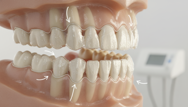 マウスピースを装着すると、歯に微弱な力が継続的にかかります。この力によって、歯の周囲にある「歯根膜」という薄い膜が伸び縮みし、歯槽骨が吸収・再生されることで歯が移動します。特に新しいマウスピースに交換した直後の1〜2日間は、歯が押されるような締め付け感や鈍い痛みを感じやすい時期です。