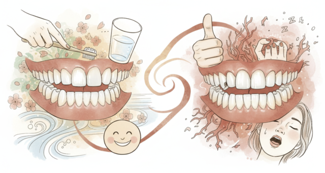 よく噛めないまま飲み込むと、胃腸に負担がかかり、消化不良や栄養吸収の低下につながります。また、咀嚼回数が減ると、唾液の分泌量も減少し、口腔内の自浄作用が弱まります。